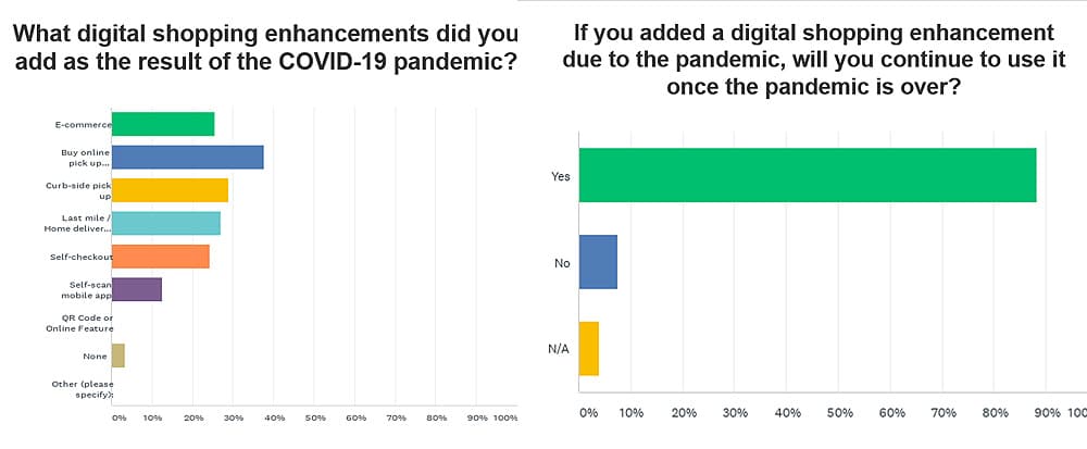 Many retailers added digital shopping enhancements because of the Covid-19 pandemic. The most added methods were: Buy-Online-Pickup-In-Store (BOPIS), curbside pickup, home delivery, and forms of ecommerce.